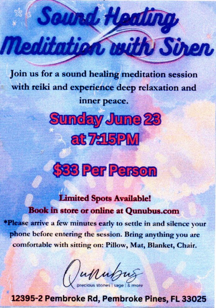 Sound Healing Meditation with Reiki Guided by Siren 1 Hour Sound Healing Meditation + Reiki Please arrive before 7:15pm, we recommend you bring something comfortable to sit/lay on (meditation pillow, mat, blanket, etc.) Chairs will be provided to those who prefer.